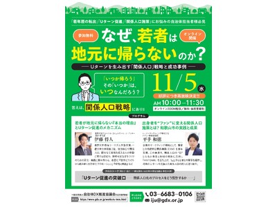 一般社団法人自治体DX推進協議会(所在地:東京都港区、以下GDX)は、多くの自治体が直面する「若年層の転出」や「Uターン促進」の課題解決の鍵となる「関係人口」戦略に焦点を当てたオンラインセミナー「なぜ、若者は地元に帰らないのか? ~Uターンを生み出す『関係人口』戦略と成功事例~」を、多数のご要望にお応えし、本日よりアーカイブ配信の申し込み受付を開始いたします。