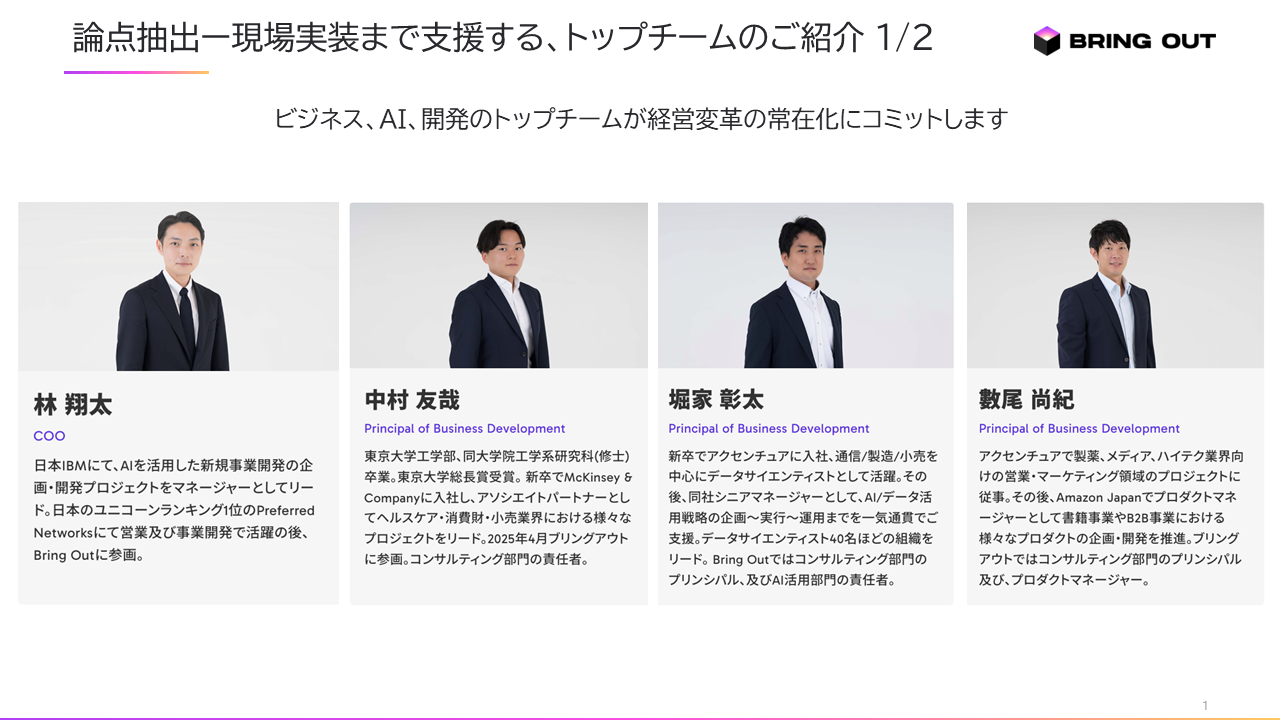 ブリングアウトはこの課題を解決するため、これまでの商談解析ツール提供から、AIで経営変革を常在化させる「AXファーム」へとその提供価値を刷新しました。