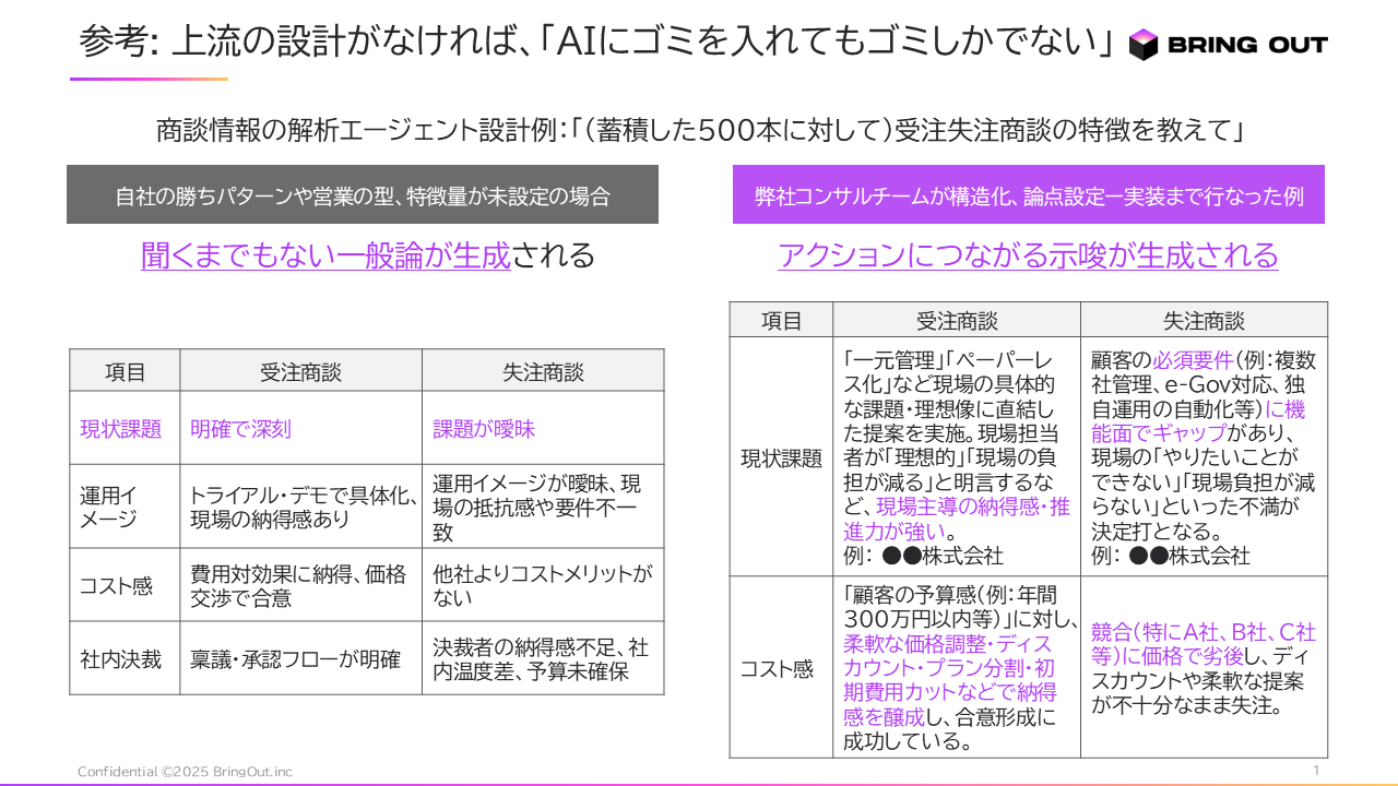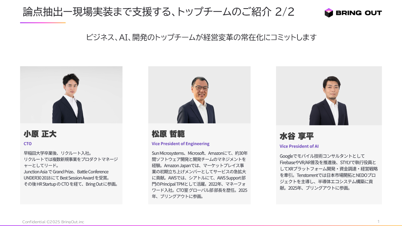 ブリングアウトはこの経験から、要望に基づき「AIの精度を上げる」よりも、"何を変えるべきか"という論点を構造化し、経営層と合意したうえで、その論点を一気通貫でAIに実装させることこそが真の価値であると再定義しました。