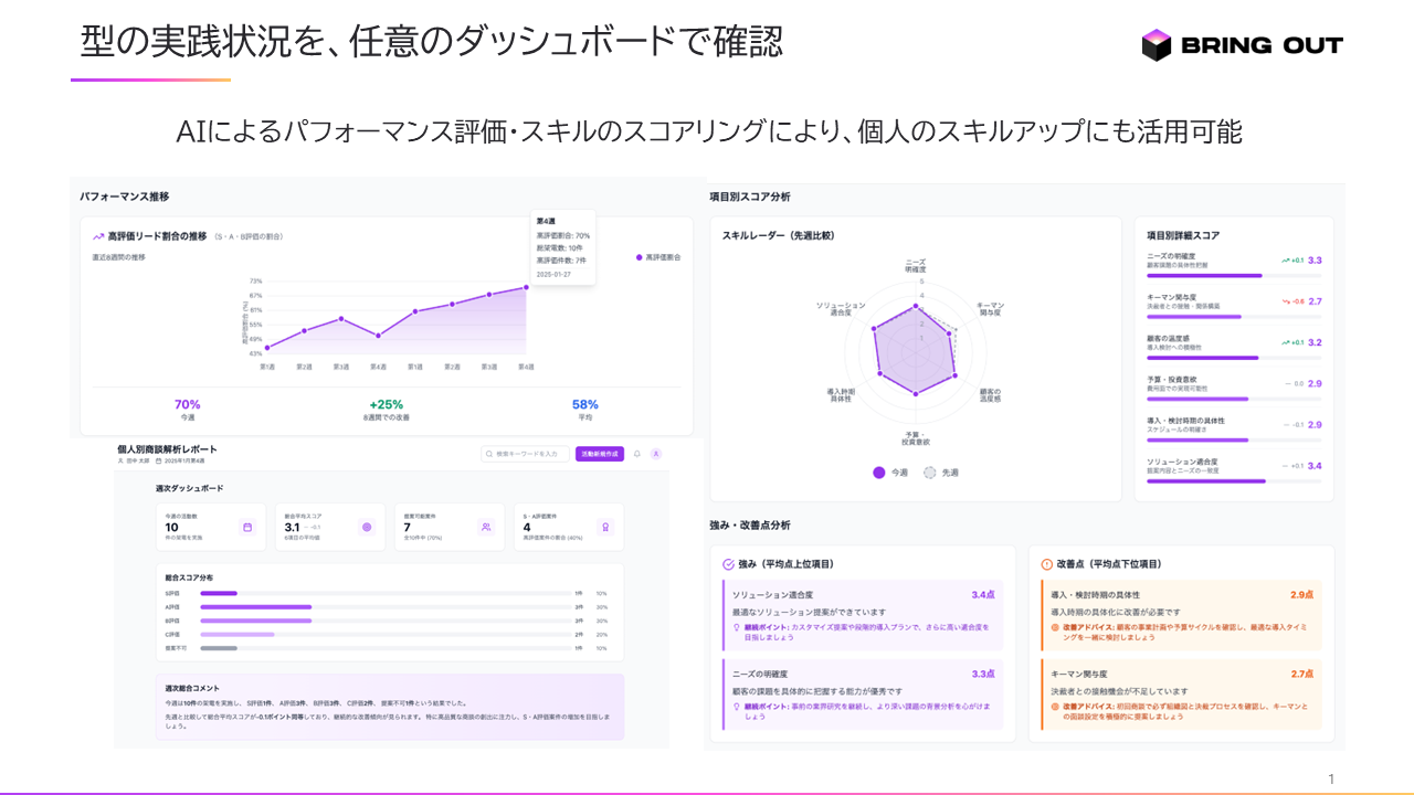 ブリングアウトはこれまで、カスタマイズ可能な商談解析ツールとして、クライアントごとに個別カスタマイズしたソフトウェアを提供してきました。営業商談や会議内容、顧客との対話ログを解析し、各企業が理想とする「商談の型」や「要約フォーマット」などを