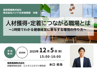 福西電機株式会社(本社:大阪府大阪市、代表取締役社長:岩本秀宣、以下、福西電機)は、2025年12月5日(金)、株式会社パソナ日本総務部(本社:大阪府大阪市、代表取締役社長:佐野克也)と、「Well-Beingな職場環境のつくり方」をテーマにオンラインセミナーを開催します。