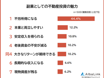 株式会社AlbaLink(本社:東京都江東区、代表取締役:河田 憲二)は、副業に興味がある500人を対象に「副業としての不動産投資の魅力に関する意識調査」を実施し、そのデータをランキングにしました。
