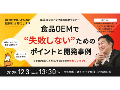食品の企画開発をサポートする「シェアシマ」を運営するICS-net株式会社(本社:長野県長野市南石堂町1972、代表取締役:小池祥悟)は、食品業界に携わる人のためのオンラインセミナーを定期開催しております。オンラインセミナーの詳細はこちら:https://shareshima.com/seminars