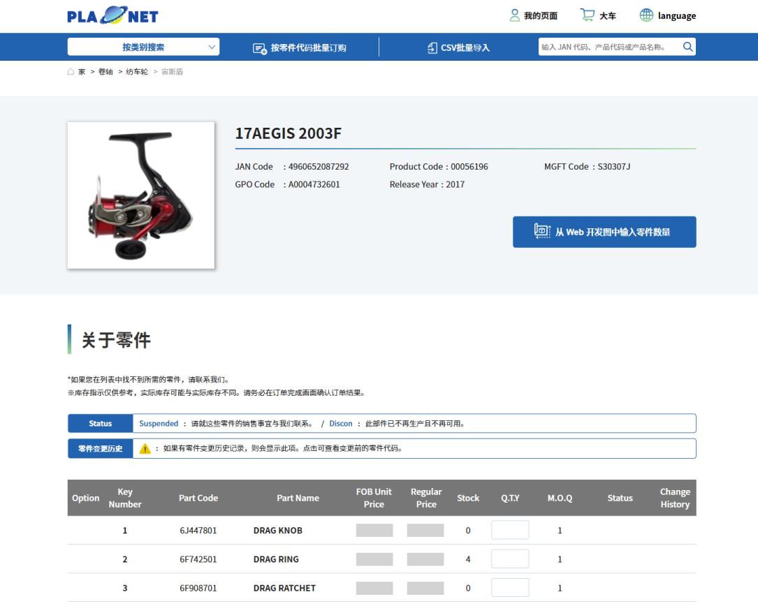 製品詳細画面の上部には製品本体の情報を、下部にはその製品に対応する部品一覧を掲載しています。