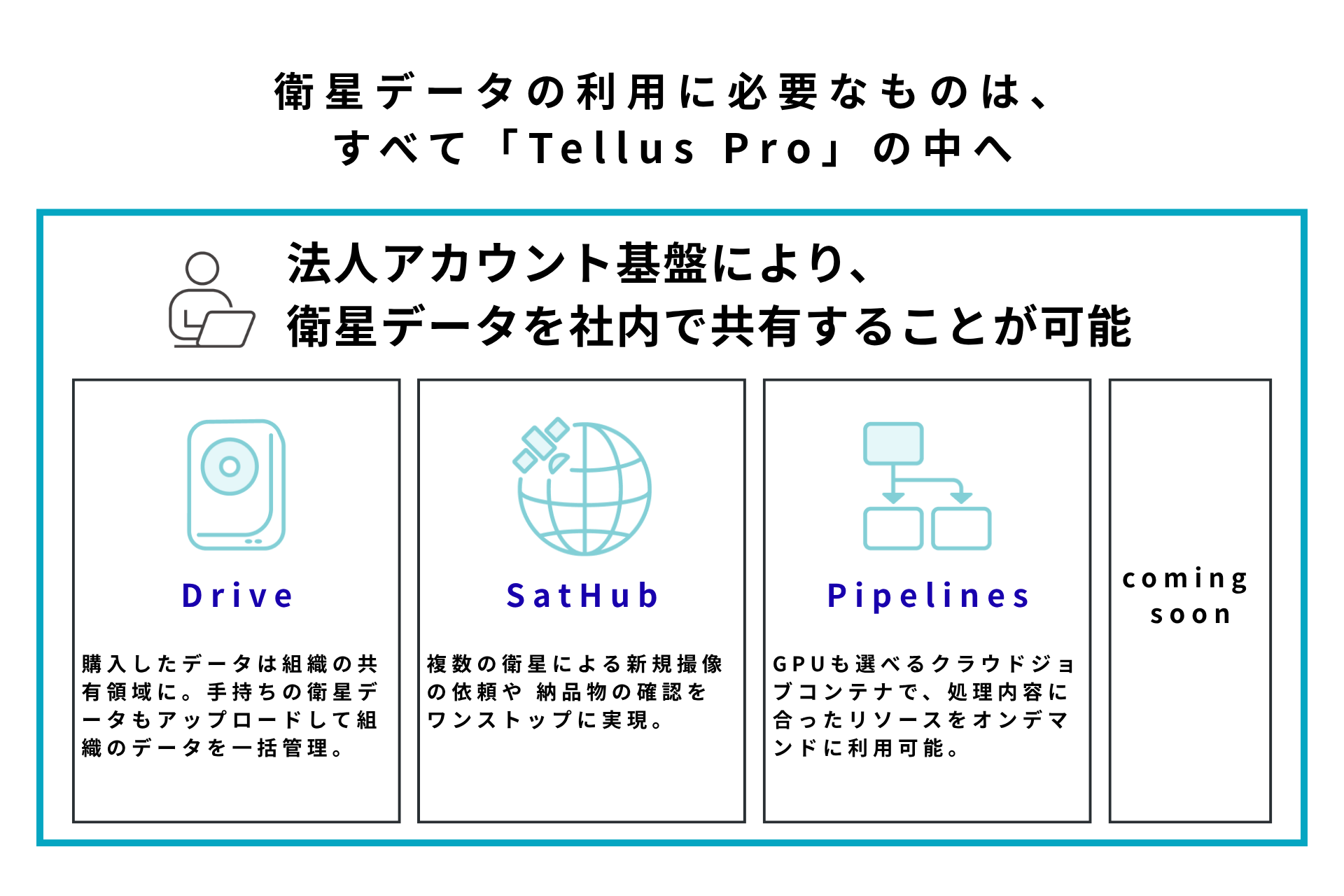 今回のリリースでは、「Tellus Pro」の中核を担う3つのサービス「Drive(ドライブ)」「SatHub(サットハブ)」「Pipelines(パイプライン)」の提供を開始します。