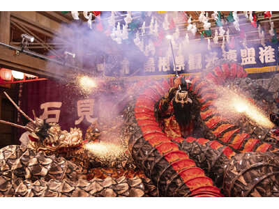 島根県西部の石見(いわみ)地域では、日本神話を題材にした伝統芸能「石見神楽」が古来より脈々と受け継がれており、時代の変化を受容しながら今なお発展を続けています。演目の中では、大蛇が火や煙を吹く迫力満点の演出が目の前で繰り広げられ、観客は神話の世界に自然と引き込まれます。