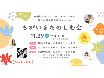 一般社団法人エニワンプロジェクト(本社:東京都練馬区、代表理事:狐崎友希)は、11月29日(土)19:00より一般社団法人設立1周年記念イベント【ちがいをたのしむ会】をZOOM配信にて開催いたします。