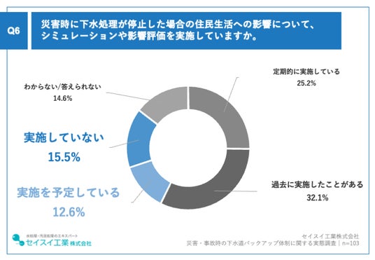 「Q6. 災害時に下水処理が停止した場合の住民生活への影響について、シミュレーションや影響評価を実施していますか。」(n=103)と質問したところ、「実施を予定している」が12.6%、「実施していない」が15.5%という回答となりました。