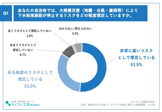 「Q1. あなたの自治体では、大規模災害(地震・台風・豪雨等)により下水処理施設が停止するリスクをどの程度想定していますか。」(n=103)と質問したところ、「非常に高いリスクとして想定している」が51.5%、「ある程度のリスクとして想定している」が33.0%という回答となりました。