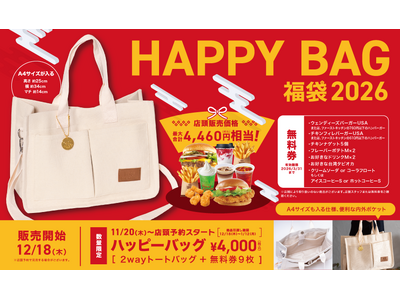 ウェンディーズ・ジャパン株式会社及び、ファーストキッチン株式会社 (所在地:東京都新宿区、代表取締役:紫関修) が展開する、ウェンディーズ・ ファーストキッチンとファーストキッチン(競馬場店を除く)では、2025年12月18日(木)10時から、オリジナル福袋を数量限定で販売します。福袋「ハッピーバッグ2026」(4,000円)は、オリジナルの2Wayトートバッグに加え、最大合計4,460円相当の商品無料券9枚がついた大変お得なセットとなっています。オリジナルトートバッグはこの機会でしか手に入らない限定品で、付属のチャームには、ウェンディーズのマスコットキャラクター『ウェンディーちゃん』と、ファーストキッチンのマスコットキャラクター『ベーグ』を表裏にあしらいました。11月20日(木)から店頭での予約販売を開始します。