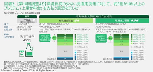 また、環境負荷の少ない洗濯用洗剤についても、約3割の回答者が10%以上のプレミアムを支払う意思を示しています(図表2)。