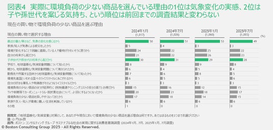 また、環境負荷の少ない商品を選択したいと答えた回答者は64%で、実際に行動に移しているのはそのうち30%でした。実際に環境負荷の少ない商品を選択している理由の1位は「最近の暑さ/寒さなど、気象の変化を感じるから」、2位は「子供世代や孫世代の将来が心配だから」です(図表4)。この順位は2024年以降の調査で変わっておらず、子や孫世代を案じる層は、環境に配慮した製品の購買層として、注目すべき層の1つと考えられます。