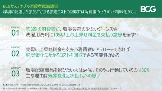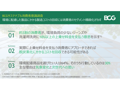 調査を担当したBCG東京オフィスのプリンシパル、伊原彩乃は「脱炭素に価値を感じ、選ぶ意思のある層はさまざまな製品について存在していることが改めて明らかになりました。その層を見極め、需要を的確に掴み、応えることが必要です。これは最終製品メーカーだけの話ではありません。素材・中間財メーカーから『顧客が自社のグリーン製品を採用してくれない』と嘆く声がよく聞かれますが、自社製品を使った最終製品の需要を自ら分析し、顧客企業に提案する姿勢も必要と考えています」と述べています。