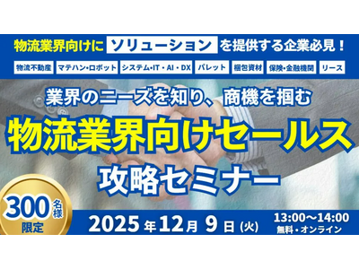 日本最大級の物流コンサルティングファーム 船井総研ロジ株式会社(本社:東京都中央区、代表:橋本直行、以下「船井総研ロジ」)は、2025年12月9日(火)13:00~14:00、「物流業界向けセールス攻略セミナー ~業界のニーズを知り、商機をつかむ~」をオンラインで開催いたします。