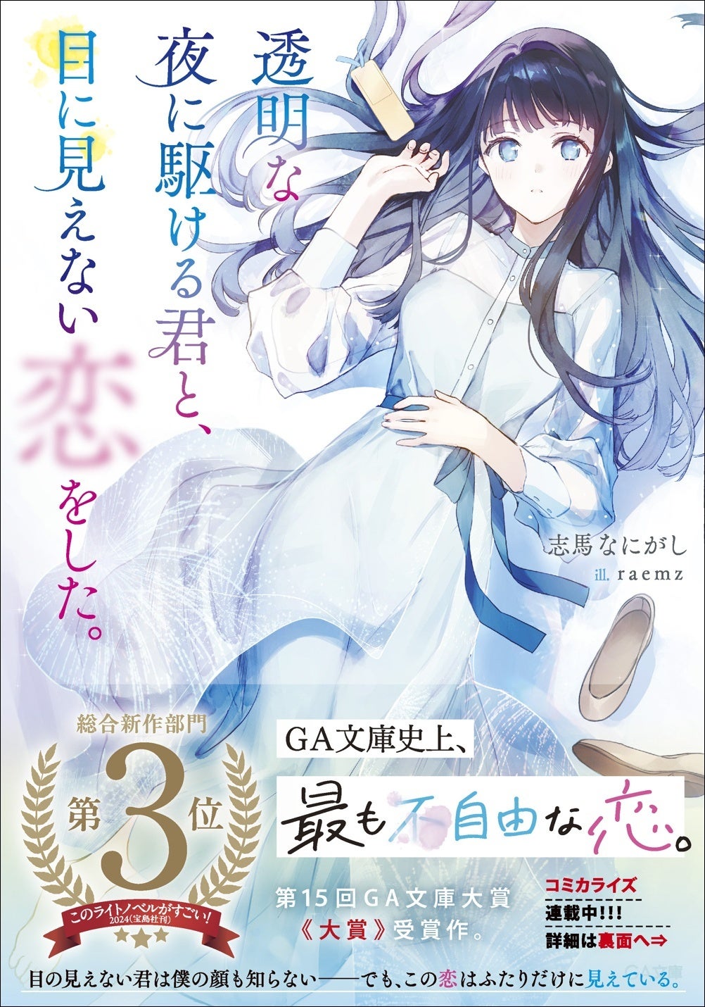 原作小説『透明な夜に駆ける君と、目に見えない恋をした。』(GA文庫)は、内気な性格で他人との関わりを避ける大学生・空野かけると、目が見えないながら前向きでいつも明るいヒロイン・冬月小春が出会い、お互いに惹かれあっていく純愛を描いたラブストーリーです。『このライトノベルがすごい!2024』(宝島社刊)総合新作部門第3位に選ばれるなど、繊細な描写と心に響くストーリーが多くの読者の支持を集めています。