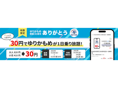 トヨタファイナンシャルサービス株式会社(名古屋市、代表取締役社長:頃末広義)が運営するおでかけアプリ「my route」は、2025年11月15日(土)~21日(金)の期間中、ゆりかもめの開業30周年を記念して、11月22日(土)・23日(日)・24日(月祝)に使える「30周年記念 QR一日乗車券」の販売をいたします。