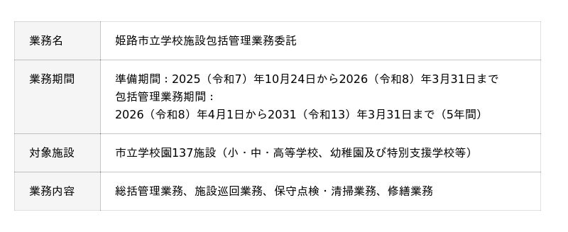 今回の「姫路市立学校施設包括管理業務委託」は、市立学校園(小・中学校、高等学校、特別支援学校等)計137施設を対象に、建物や設備の点検・保守・修繕などを一括して管理するもので、包括管理業務期間は2026年4月1日から2031年3月31日までの5年間です。