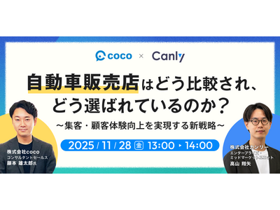 Googleビジネスプロフィール(旧・Googleマイビジネス)、Yahoo!プレイス、Appleマップなどの3大地図媒体、HP、アプリ、SNSなどの店舗集客媒体の一元管理サービス「カンリー店舗集客」の開発・提供を行う株式会社カンリー(所在地:東京都品川区、代表取締役:辰巳 衛,秋山 祐太朗)は2025年11月28日(金)13時より自動車販売店向けセミナー【自動車販売店はどう比較され、どう選ばれているのか?~集客・顧客体験向上を実現する新戦略~】をオンライン開催いたします。