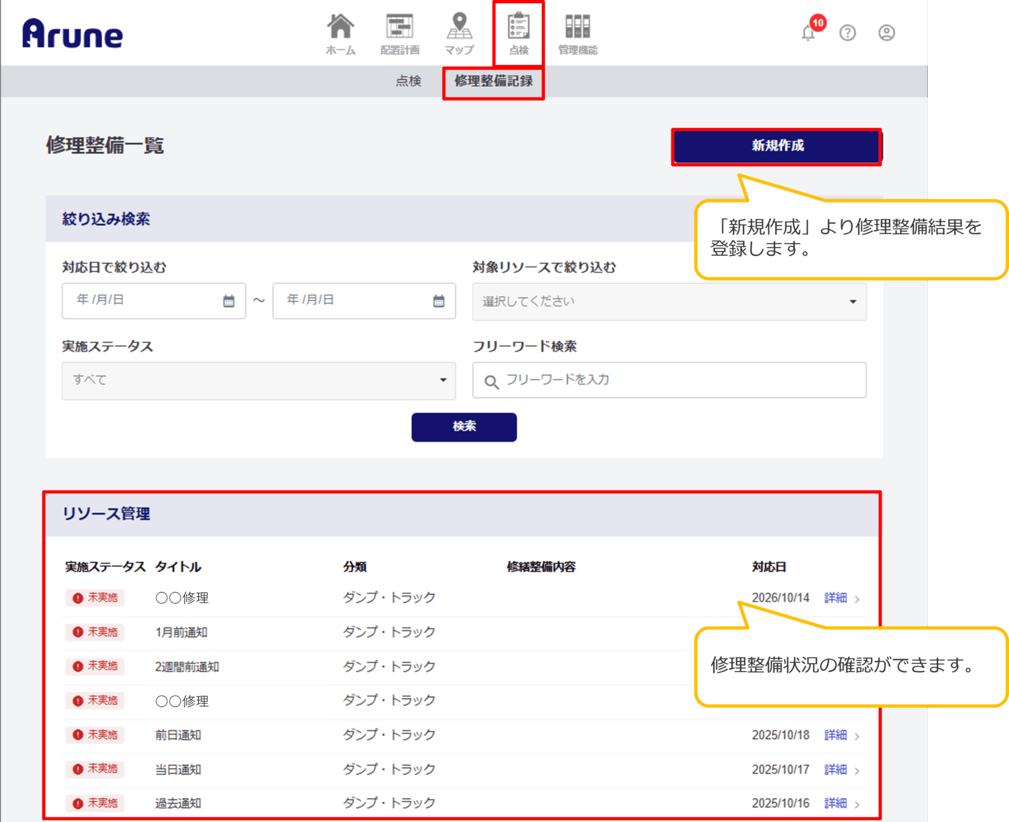 修理や整備の記録を登録し、次回対応日の通知を受け取れる機能です。また、登録した修理整備記録を一覧で確認することができ、点検漏れや対応漏れを防ぐ機能となっています。