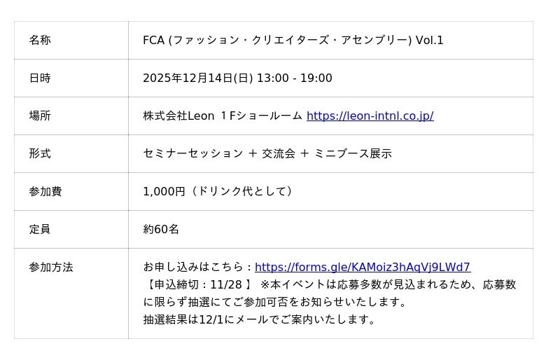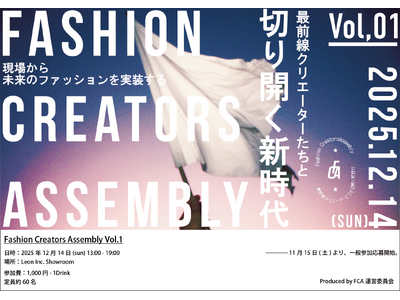 株式会社Leon(以下、Leon)は、クリエイターコミュニティ「FCA(ファッションクリエイターズアセンブリー) 」の第1回イベント「FCA Vol.1」を、2025年12月14日に主催いたします。