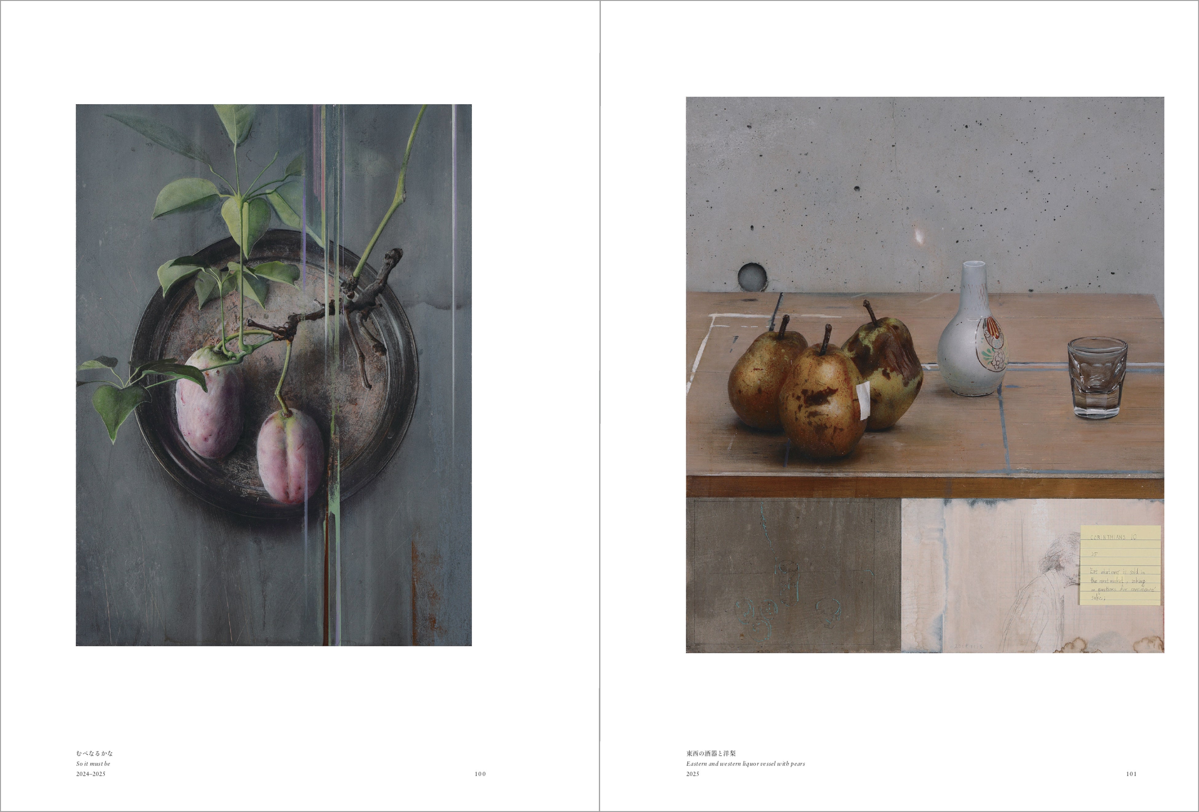 諏訪の制作は美術史や技法研究にとどまらず、歴史学や民俗学、臨床医学など幅広い分野のリサーチに基づいています。今回の展覧会では、「食物起源神話」をテーマとした静物画シリーズを発表しました。神や人の身体が作物や生命へと姿を変え、自然の循環の中で生が受け継がれていくという物語を題材にしたものです。この制作には赤坂憲雄が著書「性食考」(岩波書店、2017年)で論じた神話や儀礼への洞察が影響を与えています。また、藤野可織はこれらの静物画からインスピレーションを受け、短編小説「さよなら」を書き下ろしました。