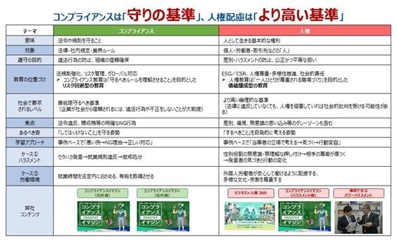本教材では、こうした「ビジネスと人権」の関係性をわかりやすく解説すると共に、コンプライアンスと人権の違いを整理します。「ビジネスにおける人権への配慮」は、単なるリスク管理という「守りの側面」だけでなく、新たなビジネスチャンスの創出や企業価値の向上といった「攻めの側面」も秘めていることを伝え、重要性の理解と学習への動機づけを強化します。
