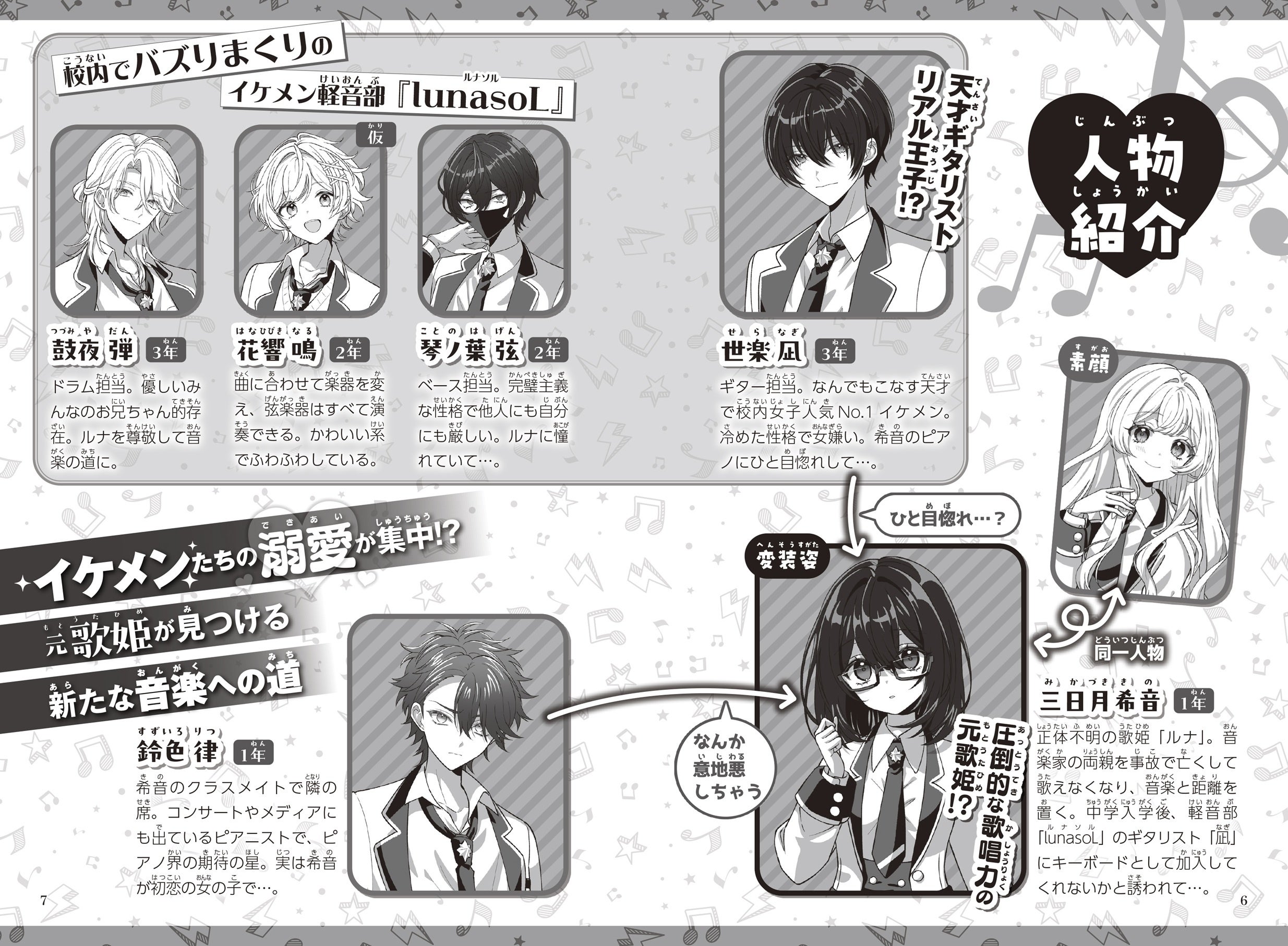 顔や素性を隠し、正体不明の歌姫「ルナ」として活動していた三日月希音(みかづき・きの)は両親を事故で亡くし、歌えなくなってしまう。トラウマをかかえながら「私立望月学園中等部」に入学した希音。何部に入るか悩んでいると、学校一のイケメンで軽音部「lunasoL(ルナソル)」のギター担当「凪(なぎ)」にたまたまピアノを弾いているところを聴かれてしまい…熱烈な勧誘を受ける。希音は軽音部に入部するのか、また歌と音楽を克服できるのか。