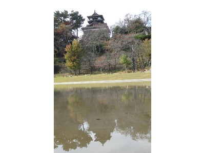 今年、城の西側に整備された水盤上に映った逆さ丸岡城