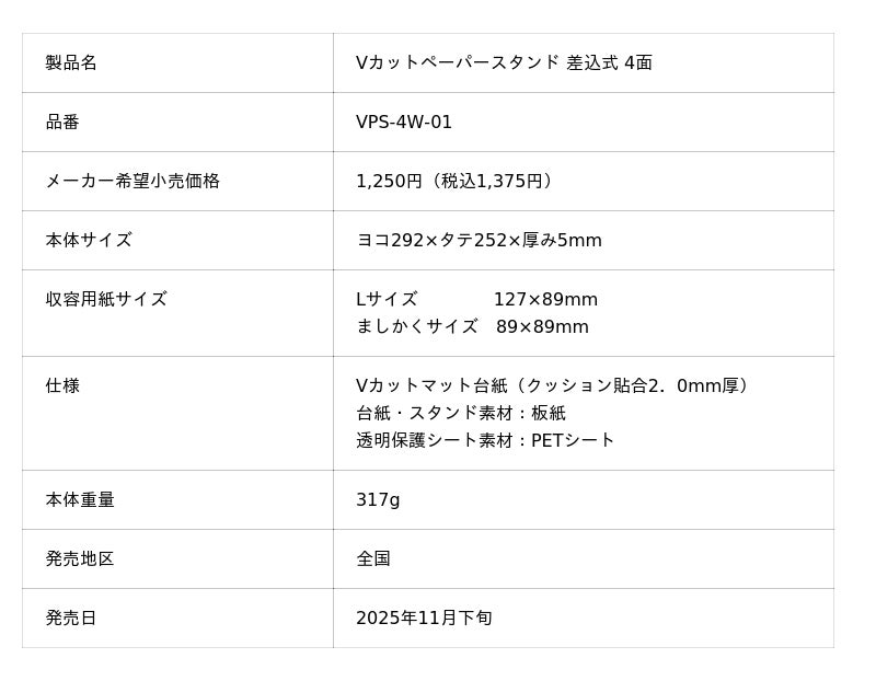 ナカバヤシ株式会社(本社:大阪市中央区、社長:中林一良)は写真の差替えが簡単な“差込式”を採用した紙製フォトフレーム「Vカットペーパースタンド 差込式 4面」を全国で2025年11月下旬より順次発売します。
