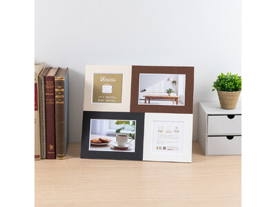 Lサイズ2枚、ましかくサイズ2枚を一つにまとめて飾れる紙製のフォトフレームです。フレーム内周部の断面を斜めにカットする「Vカット」加工と、高級感のあるエンボス加工を施したフレームにより写真を際立たせます。薄くて軽量なので飾る場所を選びません。スタンド、吊り下げ兼用タイプです。