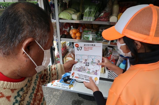 ▲詐欺被害防止のため啓発チラシを注意喚起する様子