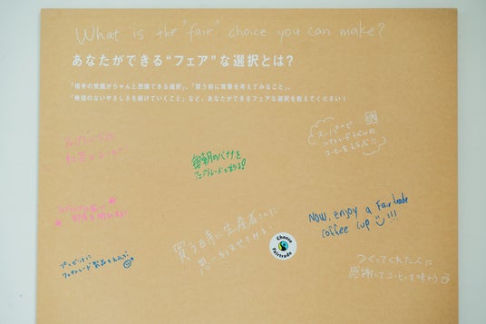 展示内容を観覧後、参加者に「あなたができるフェアな選択とは?」や「生産者へのメッセージ」を書いてもらうボードを設置。集まった声は実際に生産地へ届けられます。