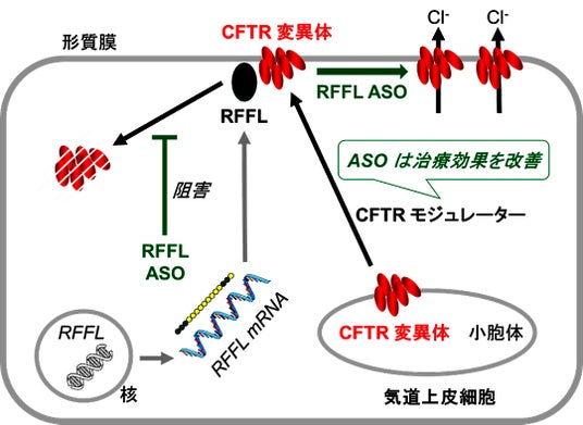 図:気道上皮細胞におけるRFFL標的アンチセンス核酸(RFFL ASO)の働き。RFFL ASOがCFTR変異体の細胞内分解を抑制し、細胞膜上への機能的発現を促進することにより、CFTRモジュレーターの治療効果を増強させている。