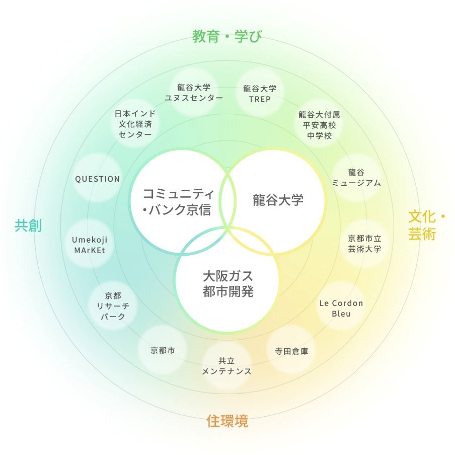 大阪ガス都市開発株式会社(所在地︓大阪市中央区/代表取締役社長︓友田 泰弘)、京都信用金庫(所在地︓京都市下京区/理事長︓榊?田 隆之)、学校法人⿓谷大学(所在地︓京都市伏見区/理事長:入澤 崇)の3 者で構成される