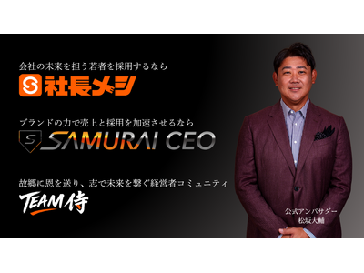 Team侍CEOは、社長メシ(※)登録社長3,000名の社長の力を集結し、日本の地方を盛り上げるために設立された経営者コミュニティです。世界に誇れる日本を次世代に残すため、日本の魅力である地方を盛り上げることを目的に結成されました。「次世代への恩送り」をコンセプトに、元メジャーリーガーの松坂大輔氏が公式アンバサダーを務めています。