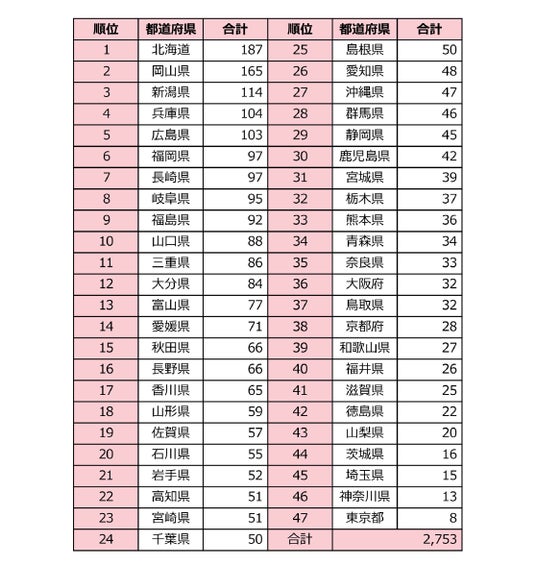 一般社団法人日本ダム協会によれば、表1に示すように、日本のダムは2,753基あり、 北海道がそのうちで最も多く187基あります。2番目に多いのが岡山県で、以下、新潟、兵庫、広島と続きます。