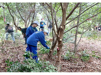2024年、「綾町イオンの森」と「割付地区の日向夏畑」が環境省の自然共生サイトに認定され、OECMとして国際データーベスに登録されました。本認定を受け、里山の新たな価値創出を目指して、綾町と当財団は連携協定を締結し、さまざまな活動を推進しています。 本年は、300名のボランティアの皆さまとともに、生物多様性保全への取り組みとして、育樹のほか、ビオトープ観察会、昆虫の住処となるバグズハウスづくりも実施します。