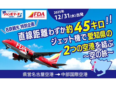 名鉄観光サービス株式会社(本社:愛知県名古屋市、代表取締役社長:岩切道郎、以下名鉄観光)は、株式会社フジドリームエアラインズ(本社:静岡県静岡市 代表取締役社長:本田 俊介 以下、FDA)とチャーター契約を締結し、「ジェット機で愛知県の2つの空港を結ぶ空の旅」を発売しました。