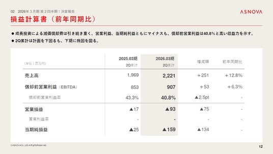 成長投資による減価償却費は引き続き重く、営業利益、当期純利益ともにマイナスで着地いたしました。しかし本来の収益力を示す償却前営業利益は前年同期比でプラス6.3%増の9億700万円、償却前営業利益率は40.8%と高い水準を維持しております。