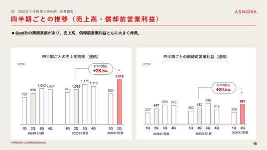 売上高は前年同期比でプラス2億5100万円増の22億2100万円で着地いたしました。償却前営業利益は前年同期比でプラス5300万円増の9億700万円となり、どちらも第2四半期累計業績としては過去最高となっております。2026年3月期第2四半期は、Qool社の主要事業であるトイレレンタル事業において長期契約が堅調に増加しております。