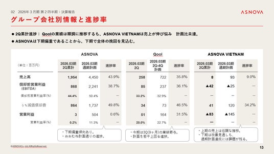 足場レンタルは下期が繁忙期であることから概ね想定通り、Qool社は売上高・償却前営業利益ともに進捗率は30%を超えており、こちらも想定通りの進捗となっております。ASNOVA VIETNAMについて、現在は投資フェーズであり、機材センターの拡張や足場への投資などを行っていることから利益をだすには時間がかかりますが、2030年度の営業利益黒字化を目指します。