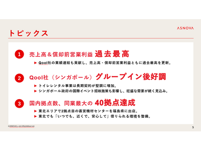 また、シンガポール政府の国際イベント周知施策も影響し、今後も旺盛な需要が続く見込みです。なお、現地にはASNOVAスタッフが常駐し、PMIも順調に進捗しております。そして、2025年8月に東北エリアで2拠点目の直営機材センターを福島県に出店いたしました。これにより、国内拠点数が同業最大の40拠点を達成いたしました。