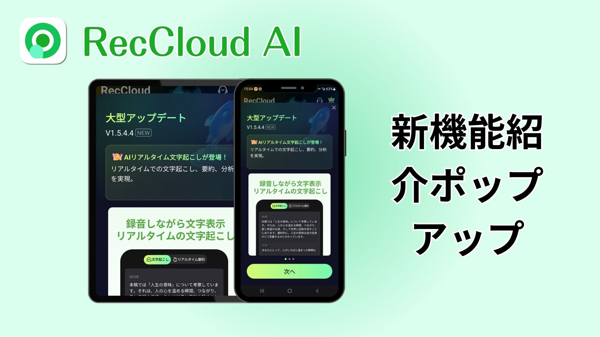 AIを活用した音声・動画プラットフォーム「RecCloud」は、モバイルアプリ(iOS/Android)に新機能「リアルタイム文字起こし(リアルタイム転写)」を搭載しました。