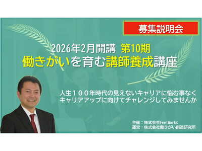 企業の人材育成支援を行う株式会社FeelWorks(本社:東京都、代表取締役社長:前川孝雄)は、2026年2月開講の「働きがいを育む講師養成講座 10期生」の募集を開始しました。それに伴い、無料オンライン説明会を開催することをお知らせいたします。