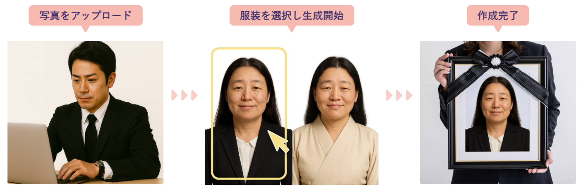AIみかえるは、遺影写真や会葬礼状、メモリアルムービーなど、これまで外注や人の手で対応してきた業務を、生成AIを活用し短時間で内製化できる業務サポートツールです。