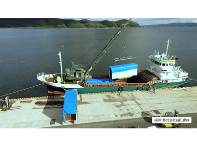 貨物船に積み込みをされるモバイル建築ユニット(提供:株式会社益田建設)
