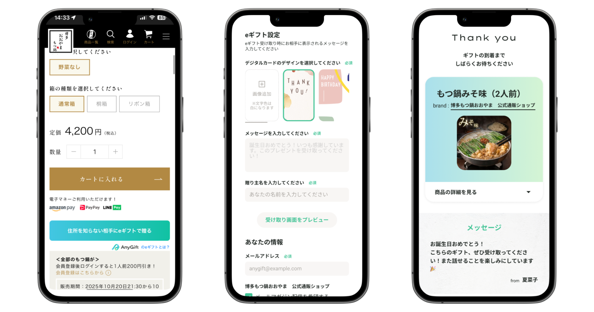 今回のAnyGiftの導入により、「博多もつ鍋おおやま公式通販ショップ」の人気の商品がeギフトとして贈れるようになりました。
