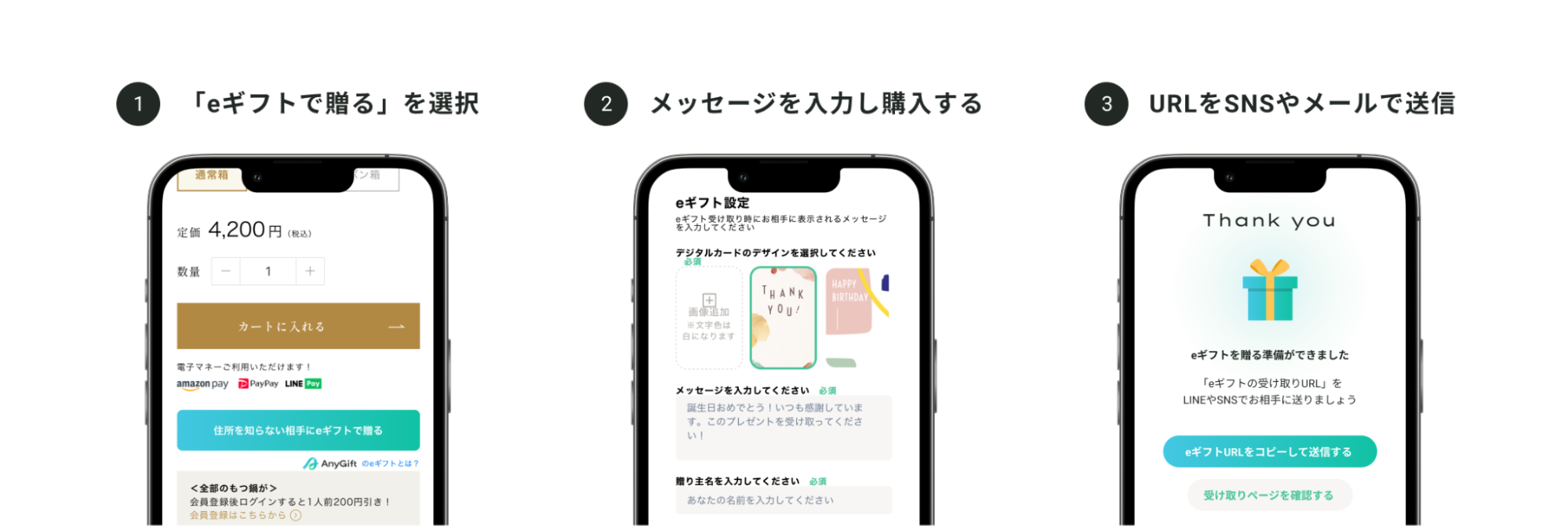 AnyGiftを活用したeギフトでは、住所を知らなくてもSNSやメールで簡単に贈ることができ、受け取る方がご自身で配送先を選択できます。これにより、よりスムーズで心のこもった“贈る体験”をお届けできるようになります。