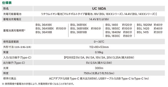 https://www.hikoki-powertools.jp/products/powertools/battery/uc18da/uc18da.html