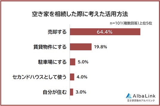 自身や家族が空き家を相続した経験がある101人に「空き家を相続した際に考えた活用方法」を聞いたところ、圧倒的1位は「売却する(64.4%)」で、6割以上の人から回答を得ました。2位は「賃貸物件にする(19.8%)」でした。